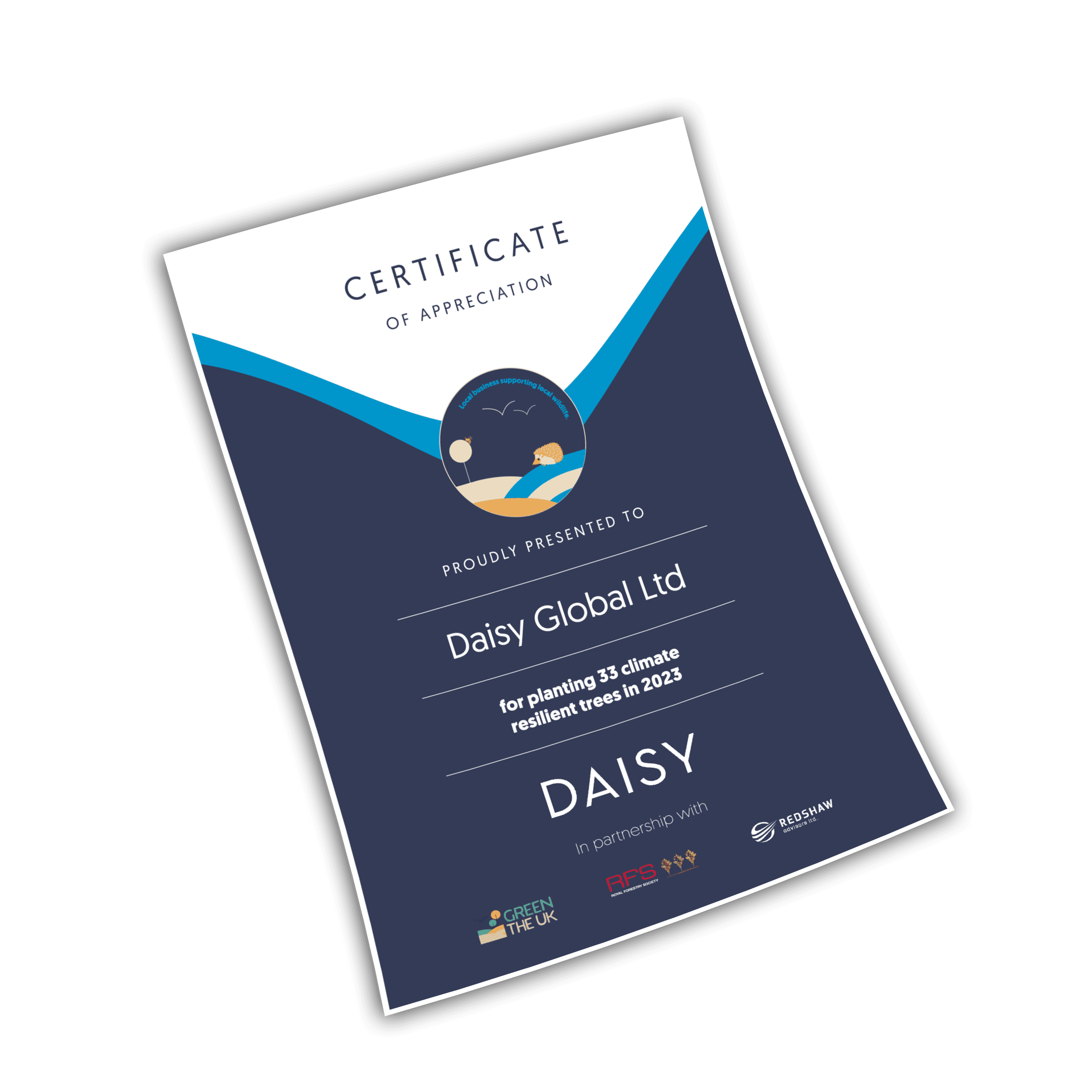 By planting trees with Redshaw Advisors, GreenTheUK and the Royal Forestry Society, you'll receive a certificate like the one below.