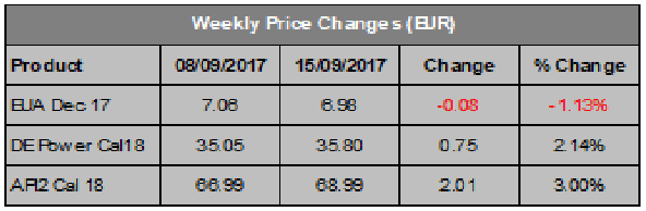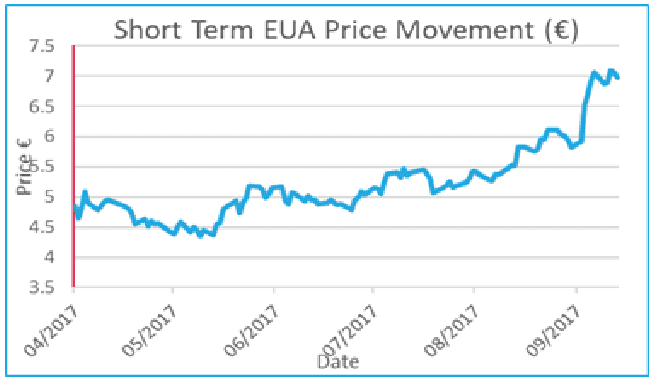 Carbon fell 8c last week to end the week at €6.98 having hit a new 2017 high at €7.72 intra-week. We were cautiously bearish last week but we certainly didn’t expect a trading range of €1.20 and quite such an action-packed week. The underlying cause of price increases since May, strong power prices, has remained the same over the last few months but the related markets went into overdrive last week as strong power prices, influenced by climbing coal and gas prices, took carbon hostage resulting in large price gains. Last week’s power price rise led the clean dark spread to new year-to-date highs and brought the utilities to market in force. With the highest ever weekly auction supply coming to market last week there was pressure on prices however the excitement in other markets coupled with some upward momentum created by the positive Trilogue meeting and of course the bullish influence of the Brexit ‘safeguards’ woke the carbon markets up. Moves higher were exacerbated by speculators jumping on the band wagon but Thursday’s roller-coaster ride to €7.72 was immediately snuffed out and common sense prevailed in such a large auction week. Thursday ended up at €7.06, 4c down on the previous day and Friday at €6.98. Price Impact: with carbon fundamentals not supporting price rises it is increasingly clear that power markets are in the driving seat. This makes predicting carbon price moves hard at the moment, particularly as power prices are seemingly being