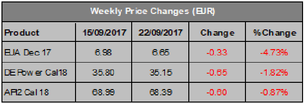 carbon is very similar to last week. Future nuclear generation availability in France remains very much in the spotlight. That availability is set to increase over the course of Q4 2017 which should put downward pressure on carbon prices, however, the forecasts and maintenance schedules look shaky as the issue continues to rumble on. Carbon has been on the current upward trajectory since May and last week’s fall in prices is not enough to signal an end to the trend. With the generation spreads still high and the nuclear situation on-going, material price falls are unlikely this week. Longer-term, we expect there is room for some further softening in prices over Q4 2017 so remain cautiously bearish with a very watchful eye on power markets and France.